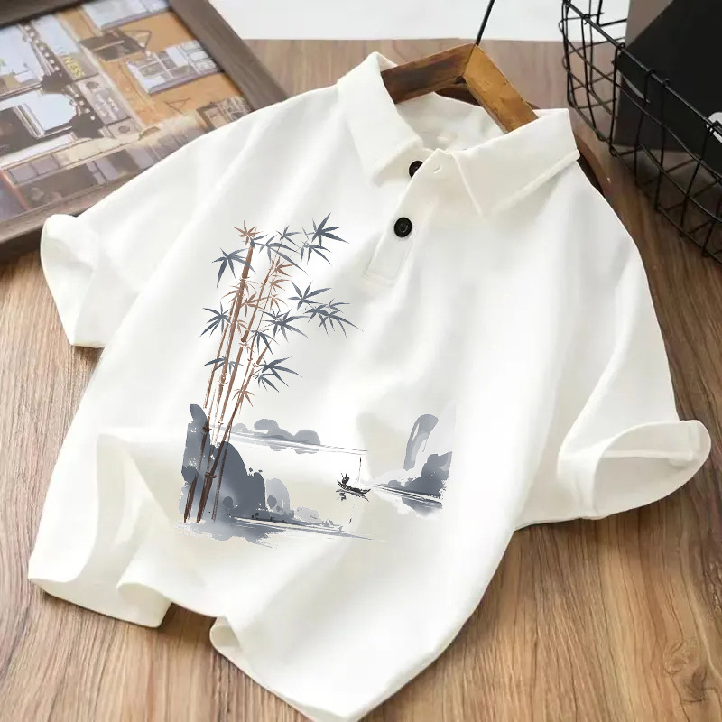 男の子の夏の新しい中国風のポロシャツ子供の中国風の墨竹半袖Tシャツ中型と大型の子供用ラペルトップトレンディ