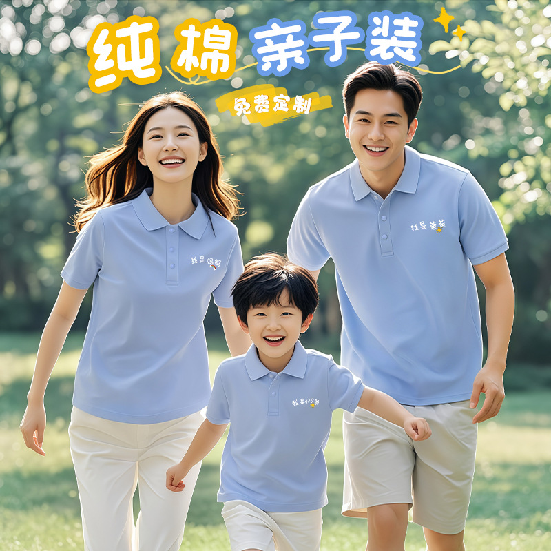 純綿親子ポロシャツカスタムTシャツ3人家族子供夏半袖家族服休暇プリントロゴ