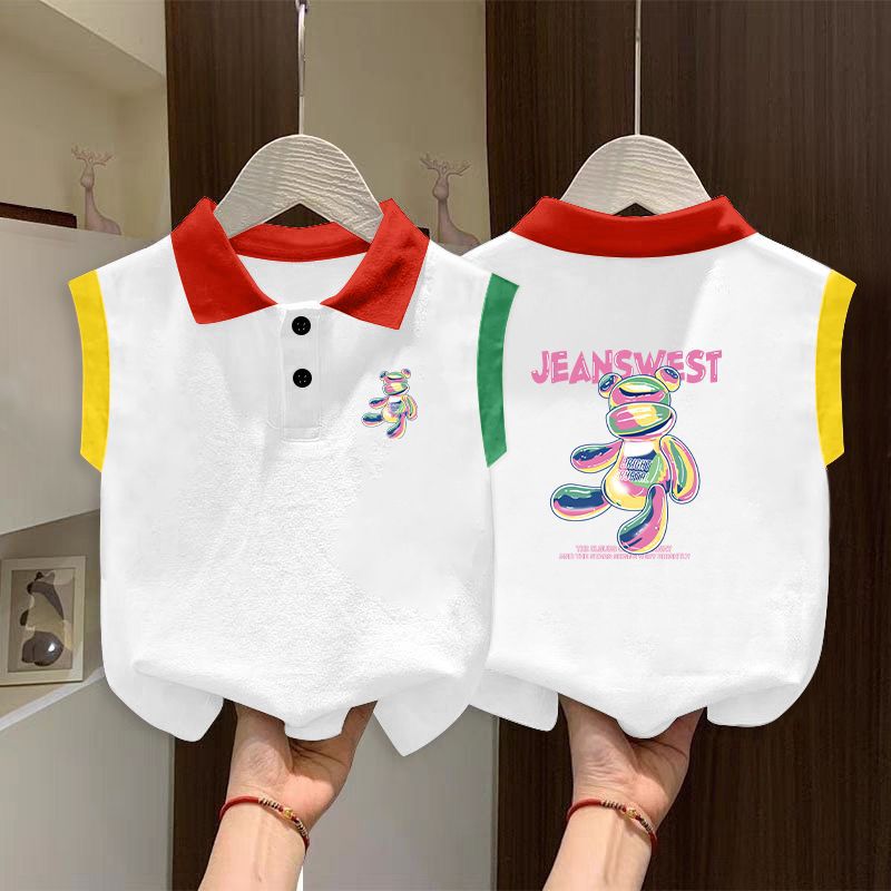 子供用ラペルポロボトムシャツ、女の子用カラーブロックノースリーブトップス、男の子用純綿、スタイリッシュな漫画プリントポロシャツ