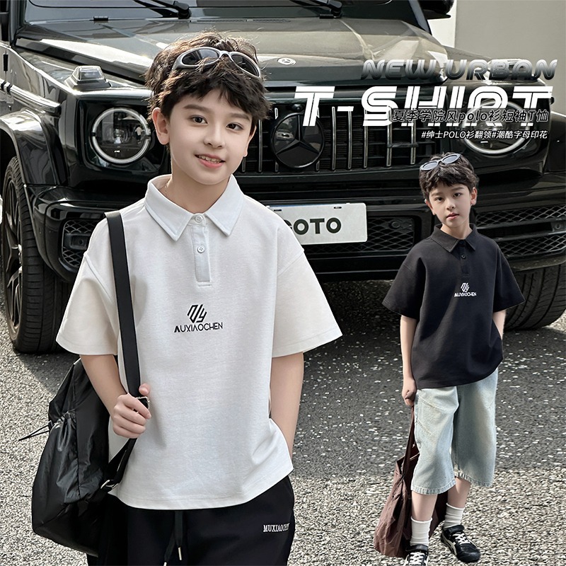 男の子と女の子の半袖Tシャツ2025新しい夏服ハンサム中大型子供韓国風ルーズトップ子供用ポロカラートレンドT