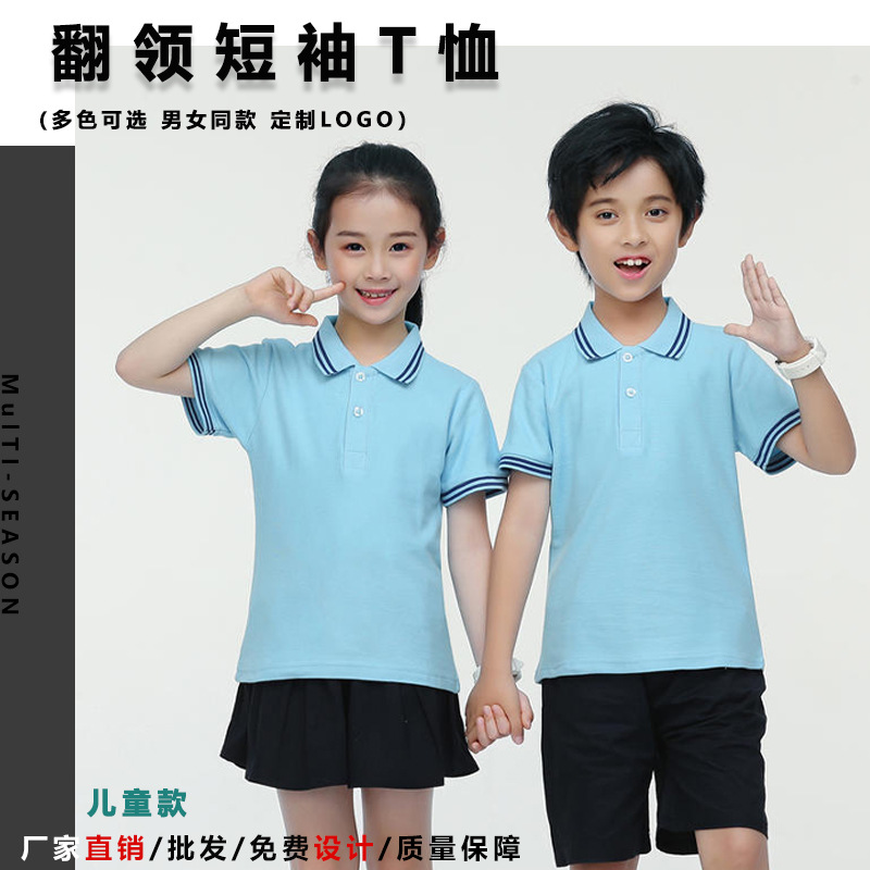 綿子供用裾上げラペルポロシャツプリントロゴプリント半袖幼稚園生クラス制服活動服