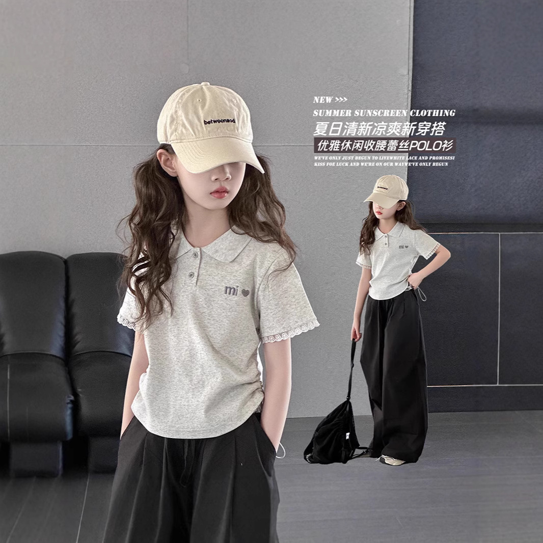 女の子ラペル半袖 Tシャツ夏 2025 新しい女の子純綿中大型子供服コントラストカラーポロシャツトップ
