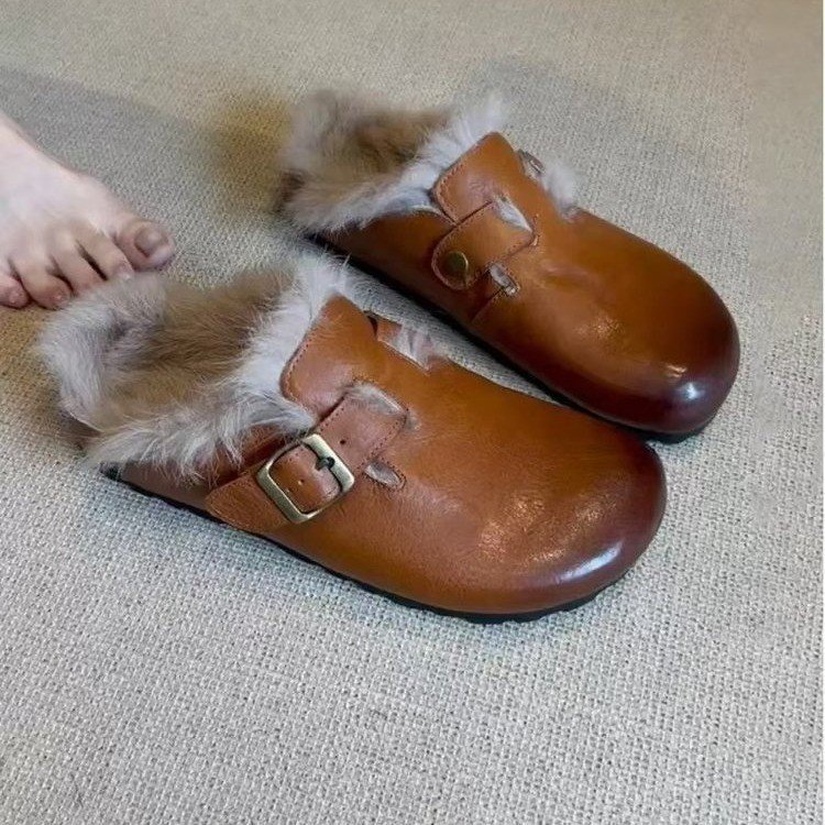 平底包頭半スリッパ毛引き女性スタイル秋冬外着保温綿毛スリッパ布ケン婦人靴