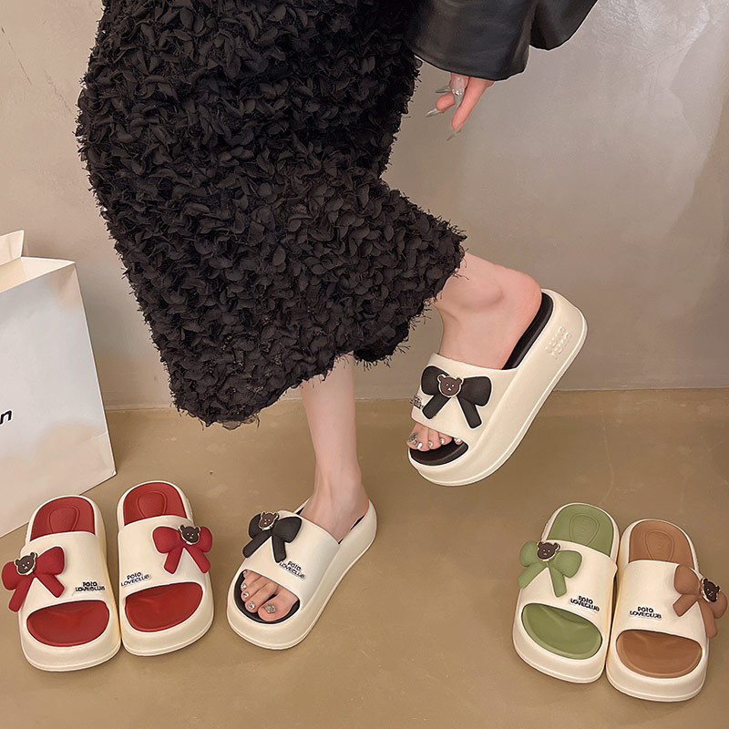 2025夏の新型サンダルの女性ファッションの厚い底の熊の蝶結びの家庭の室内の滑り止めのかわいい外着