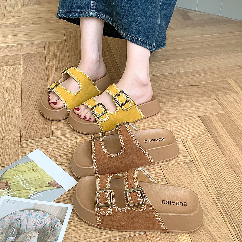 ベーケン靴の女性の厚い底のサンダルの女性の夏の外は2024の新型のファッションのベルトのバックルのカジュアルな砂浜の1字のスリッパを着ます。