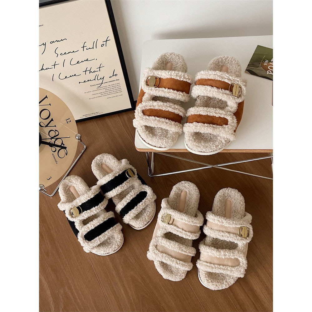 趙露思同金のフラットスリッパ2023秋冬の新型カジュアルな足の毛の靴のファッションは女性を引き合わせます。