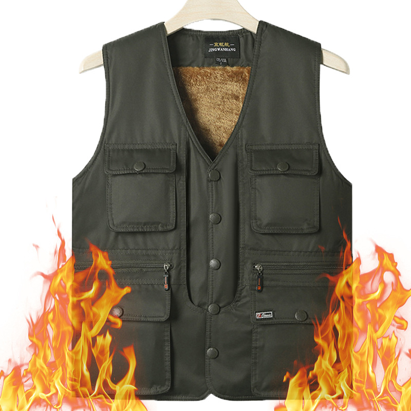 秋冬男性綿馬甲とベルベットの厚い工装馬クリップ多ポケット立襟ベスト男性戸外ファッション