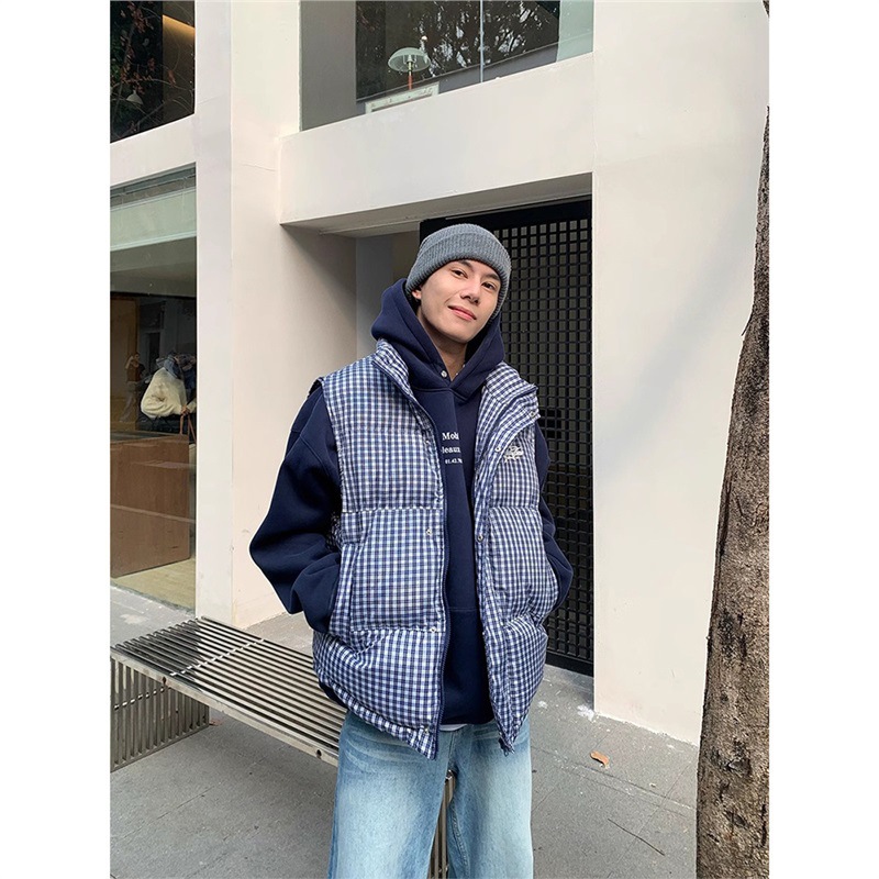 アメリカのファッションブランド秋冬レトロな格子縞の肩のゆるい馬甲綿服は袖のない防風コートの上着を重ねて着ている男性