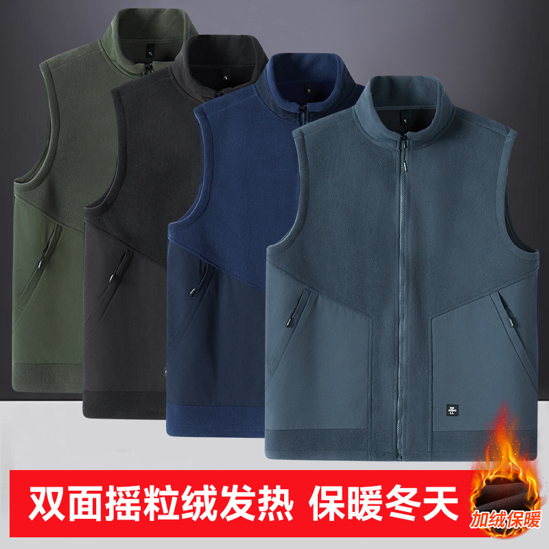 秋冬男性のベルベットは馬甲の戸外工装の保温ベストを厚くして、肩の多いポケットの馬がお父さんのコートの男を挟んでいる