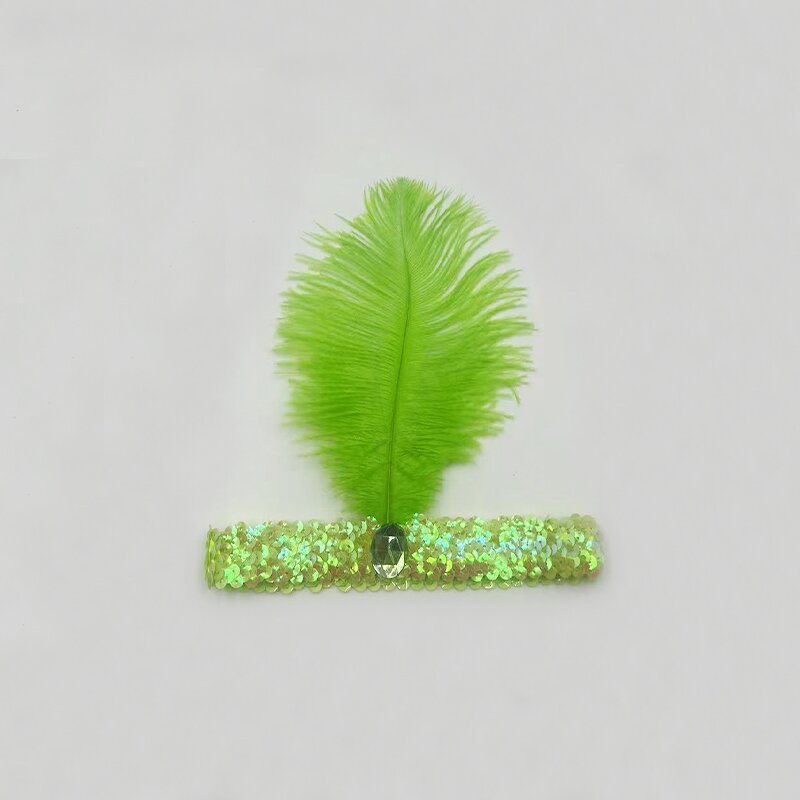 ダチョウの毛の頭はスパンコールの羽の頭をつけてダイヤモンドのヘアバンドを入れて演出します。
