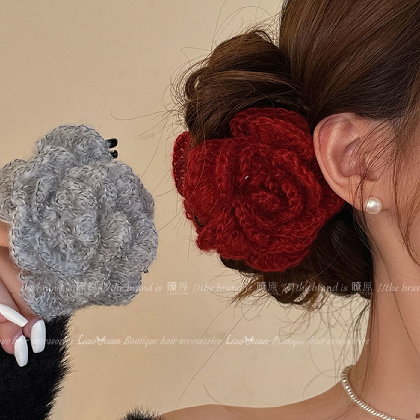 朝露薔薇 ~ 超仙毛糸花ヘアピン女後頭部クリップ高級感insサメクリップ2024新製品