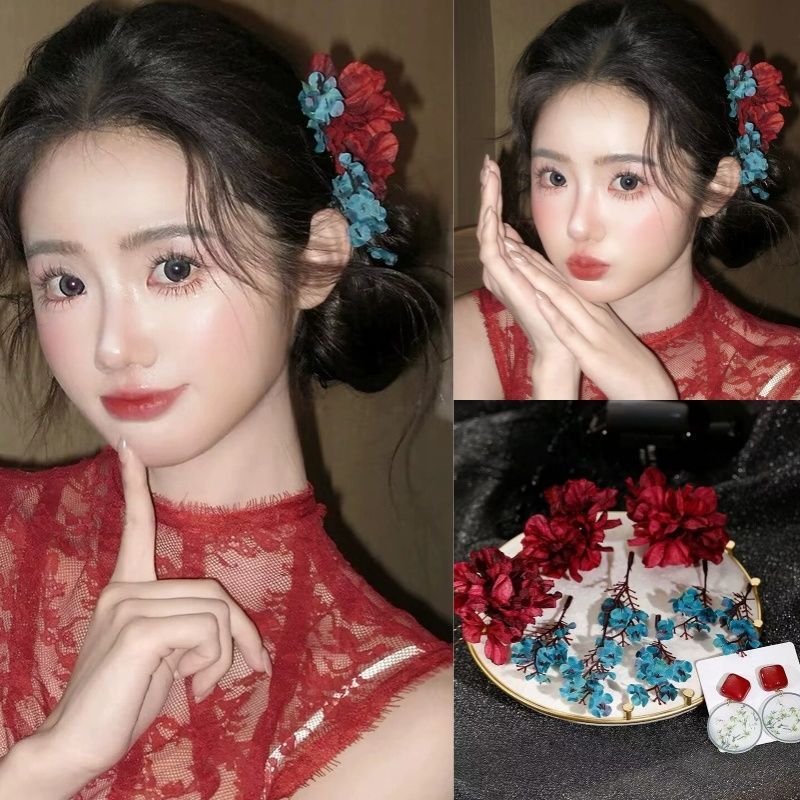 新しい中国風の頭飾り、花、青い頭飾り、赤い花のイヤリング、赤いイヤリング、中国風の人気の花嫁のヘアアクセサリー