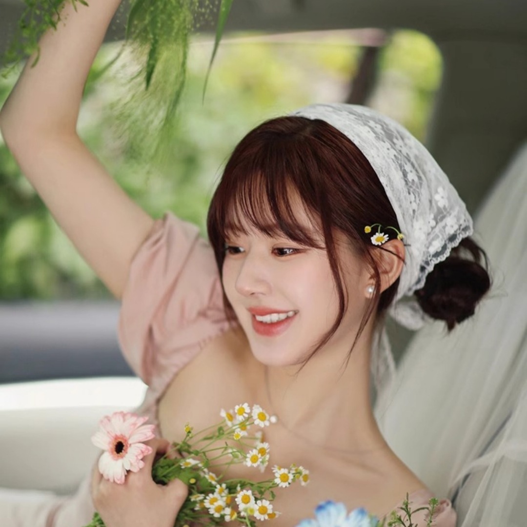 レースの花の髪にスカーフがついています。フランス旅行で写真を撮ります。