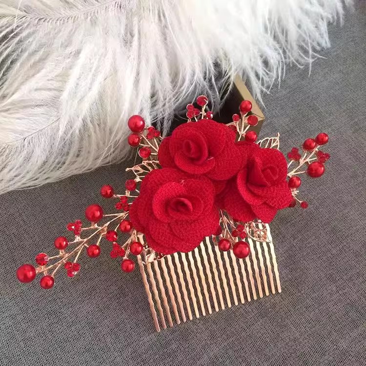 お皿の髪飾り喜姑結婚式の赤い髪の花がセットされています。