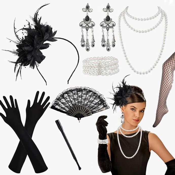 1920年代の独身パーティーのレトロな羽の頭の花セット、頭飾り、ネックレス、手袋、タバコ棒、扇子、ストッキングセット