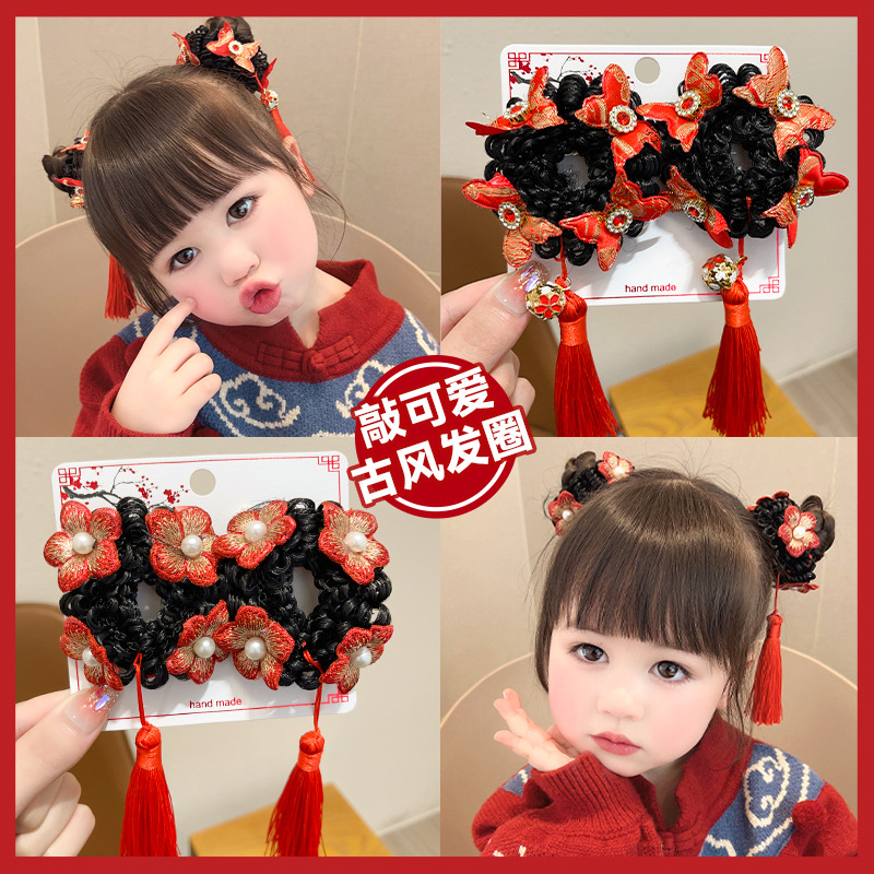 かつらの輪のフリンジの新年の輪は春節の漢服の古風な皮の筋の女性のかわいい団子の髪飾りを出します。
