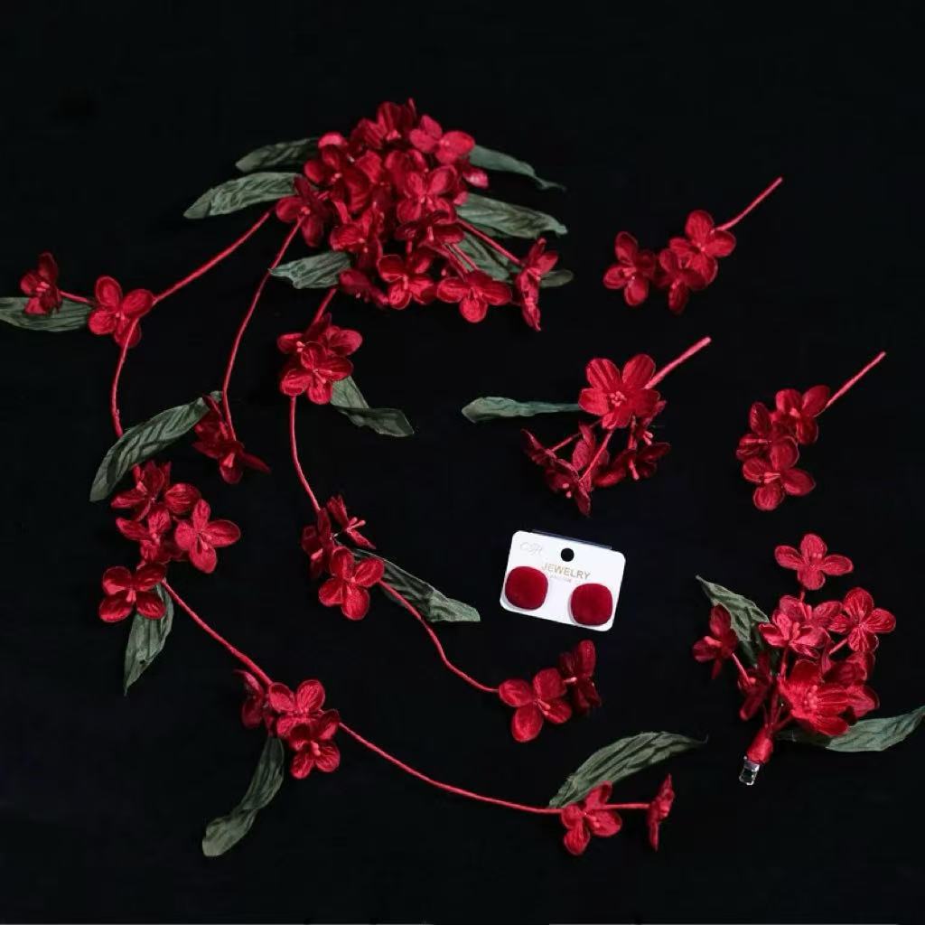 ヘラの新型オリジナルデザインの森系の赤い手作りの布芸のシミュレーション花の高級な敬酒服の結婚の新婦の頭飾り