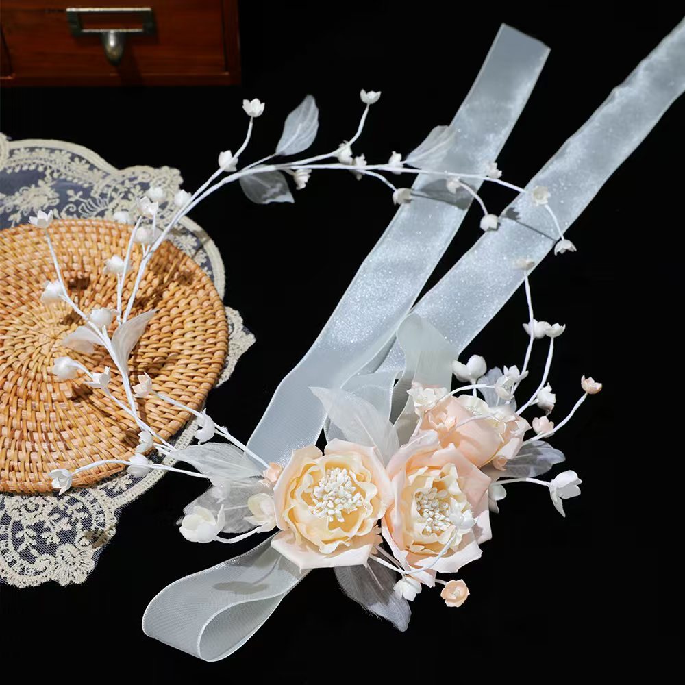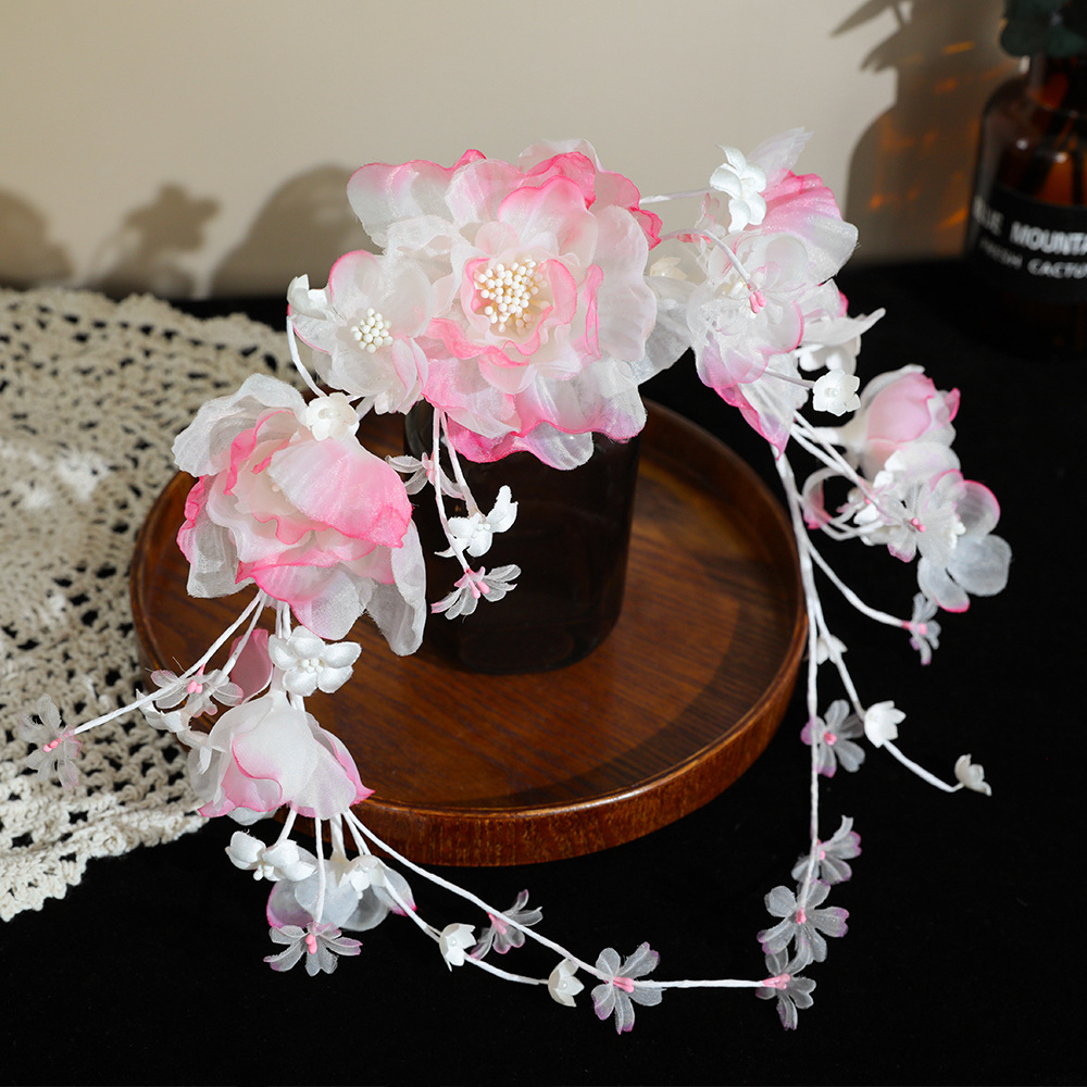 花嫁の頭飾り森系ピンクの娟紗の花のカチューシャ