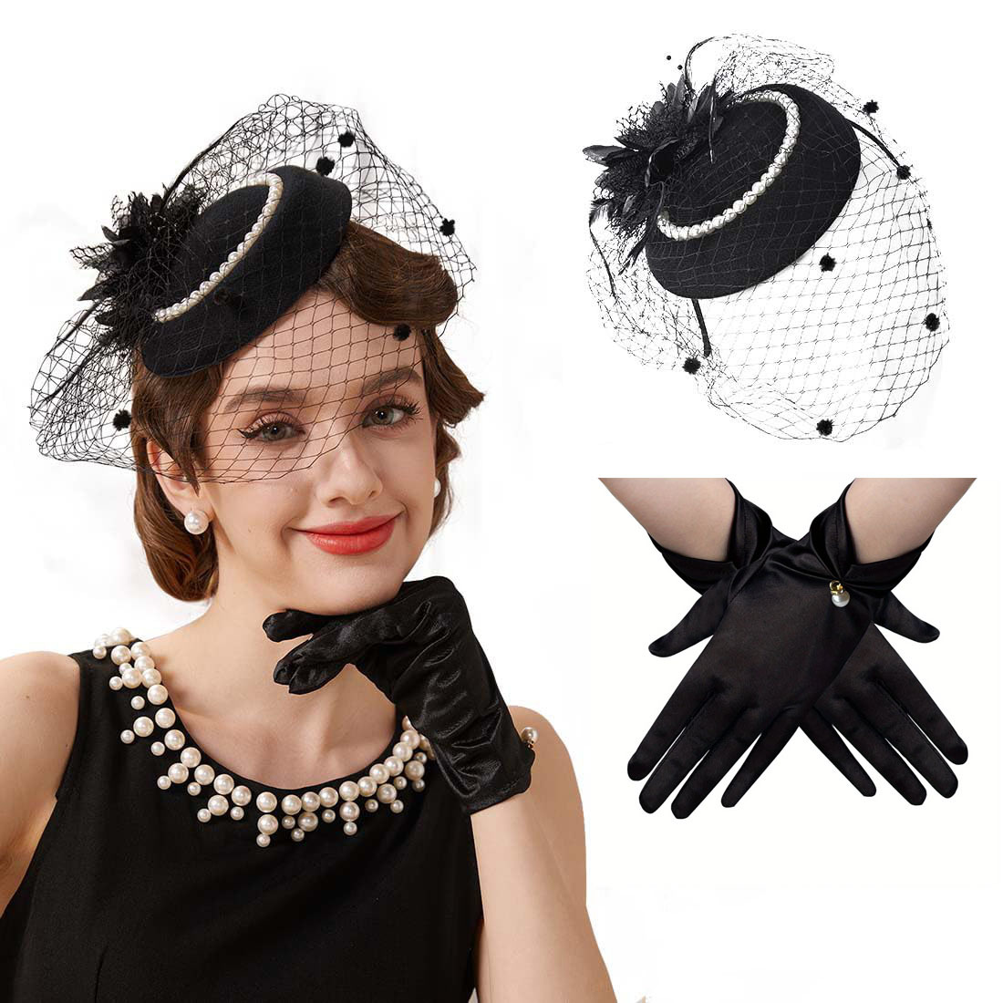 メッシュヘッドフラワー+手袋の2点セット、ヨーロッパとアメリカのヘアアクセサリー、フェザーブライダル競馬祭ヘッドドレス、ティーパーティーヘッドフラワー