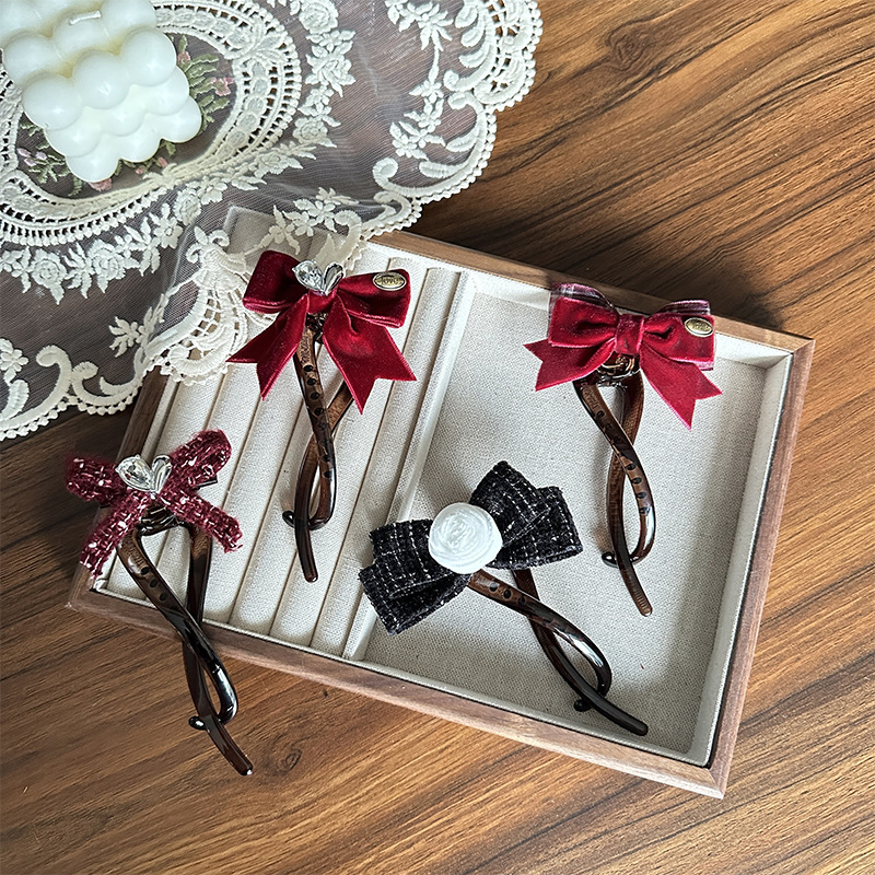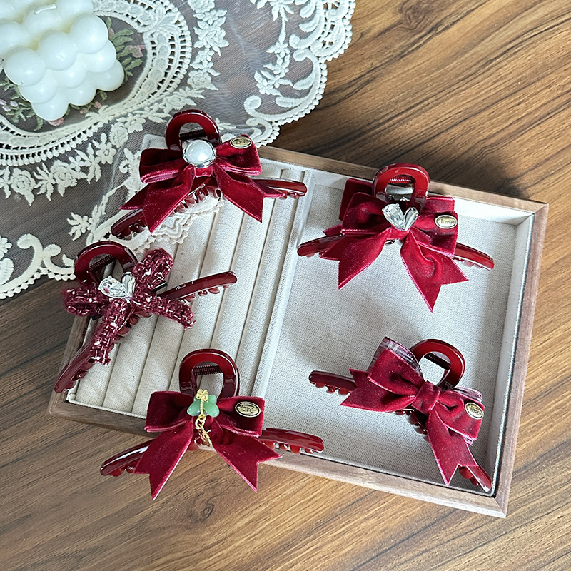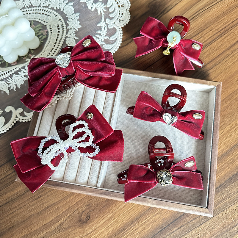 本命赤系ベルベット国風手作り蝶ネクタイが日常の雰囲気感を感じて写真を撮る髪飾りヘアパール