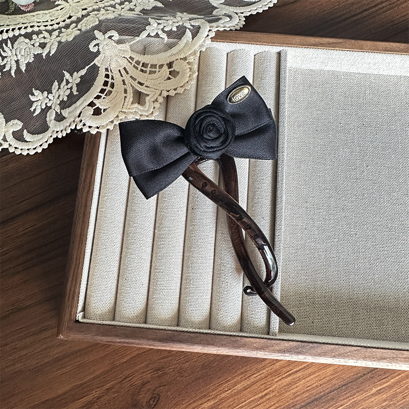レトロな雰囲気のべっこう色のヒョウ柄のバラの蝶結びの髪飾り