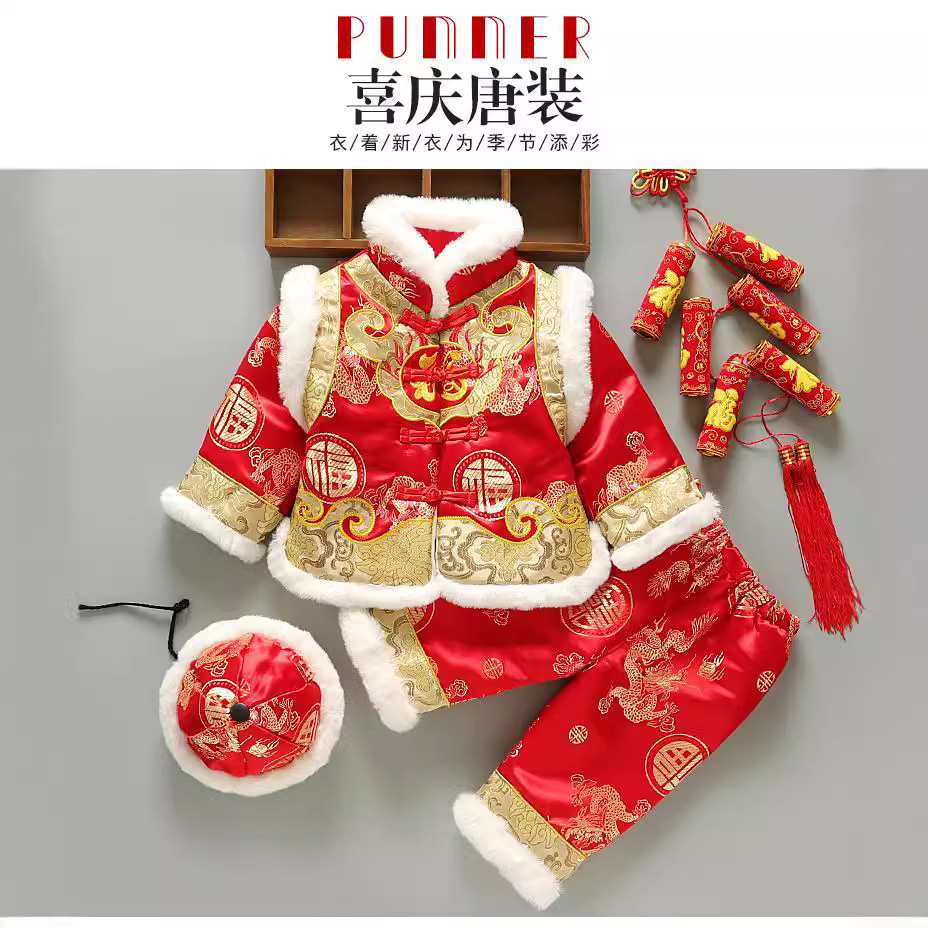 宥宝の子供服の男の子の唐の服のスーツの冬の金の厚い子供の漢服の男の子の赤ちゃんの中国風の新年の服の3つのセット