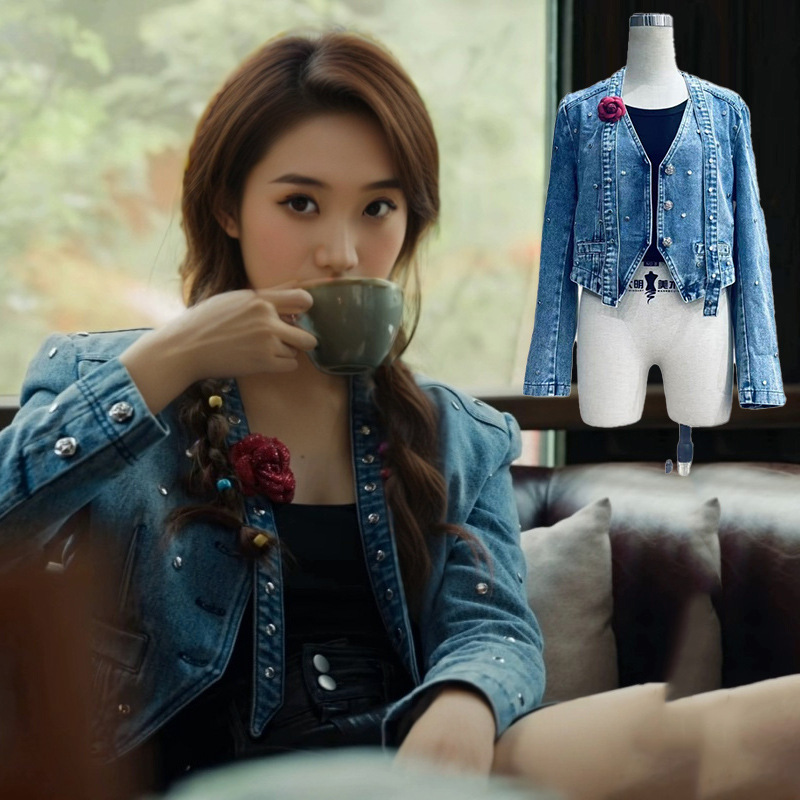 在庫あり、劉亦菲と黄宜梅と同じスタイルの服、高級リベット付きデニムジャケット、女性用秋デザインショートトップス