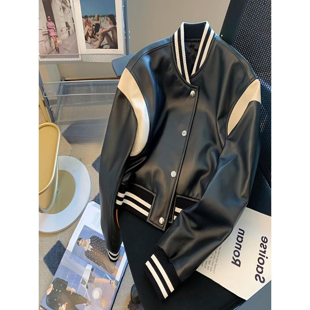 白黒の色合わせの野球服のコートの女性2024コートのゆったりしたボール服のカジュアルな革挟みの機関車の革のジャケットのショートコート
