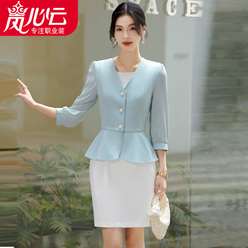 2024新品夏レディースカジュアル気質ミディアムスリーブ薄い小さいスーツのスーツのジャケットvネックのフリルの女性6010