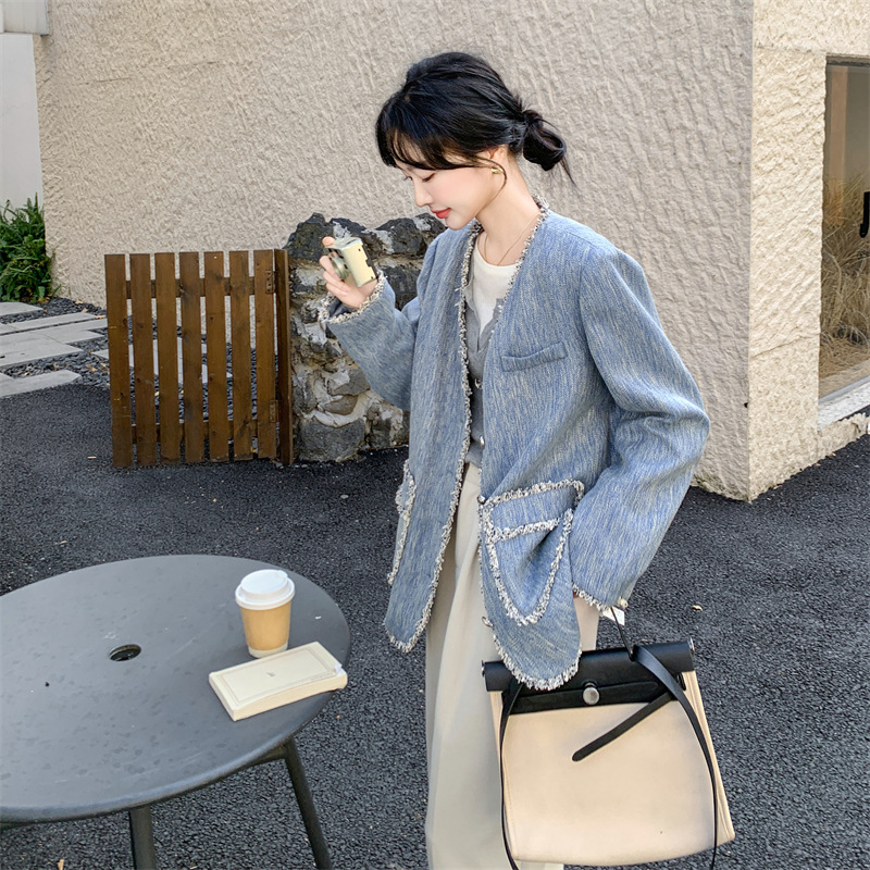 フリンジ付きブルーの小香風スーツジャケット レディース 春秋 2025年新作 エレガントなスーツ 小柄な女性向け 上品な気質