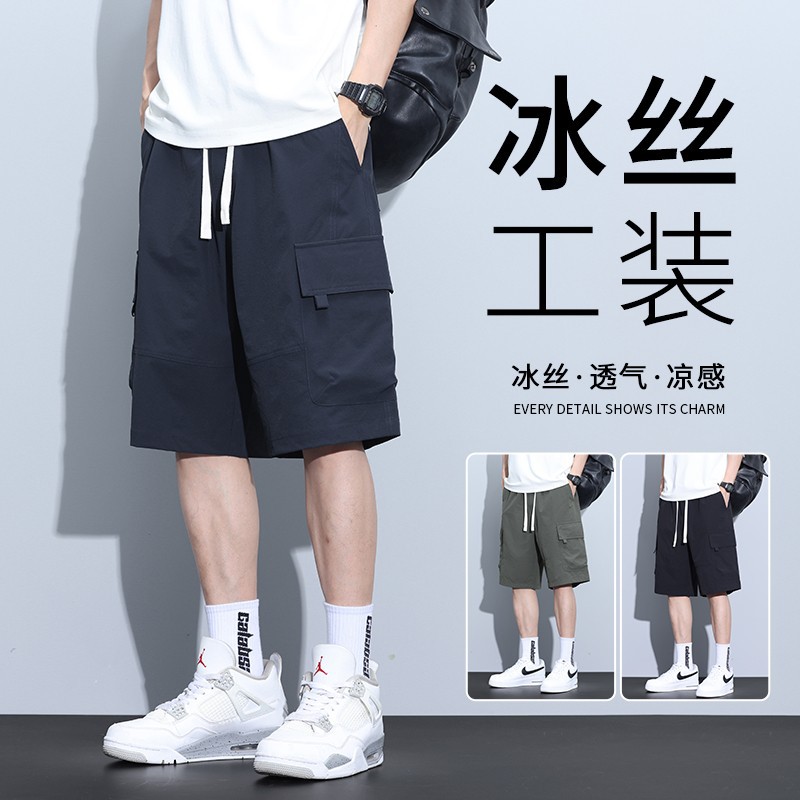 アイスシルククールカーゴショーツメンズ夏薄手速乾通気性ルーズストレートトレンドカジュアルミッドパンツ