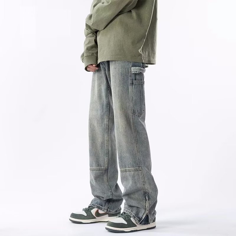 メンズリップドストレートジーンズ、ゆったり万能5点パンツ、トレンドブランド、着痩せ、おしゃれ、カジュアル、ワイドレッグミッドパンツ