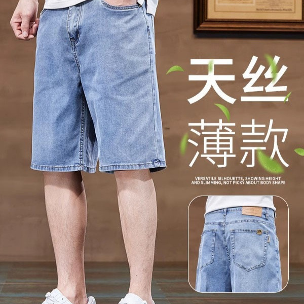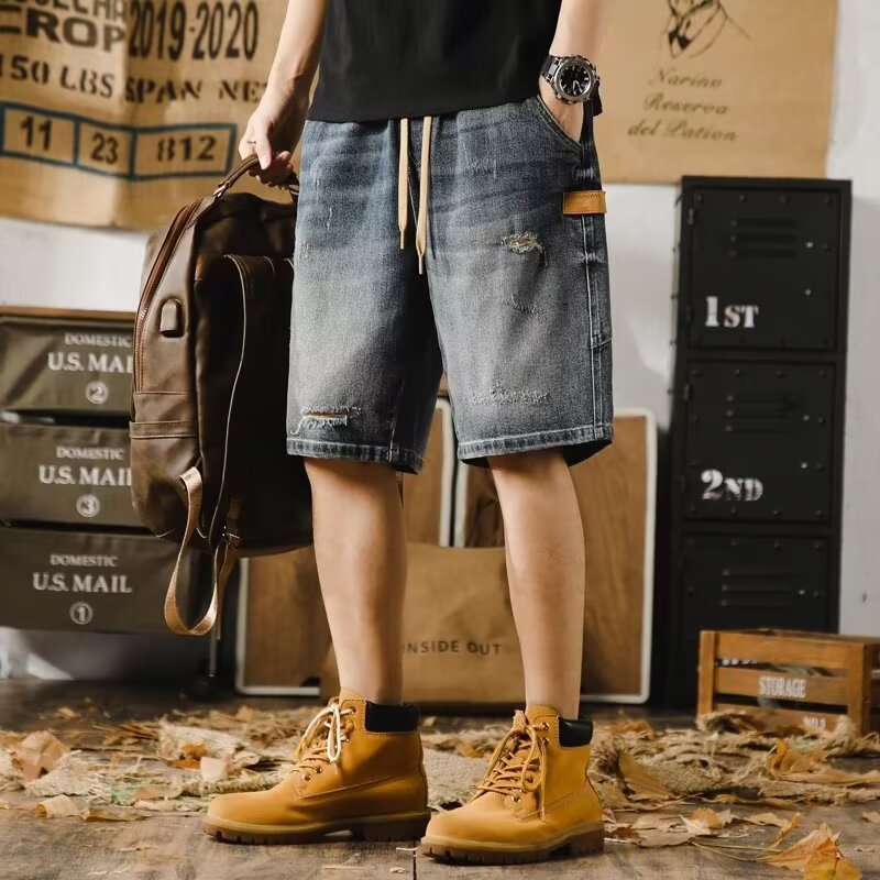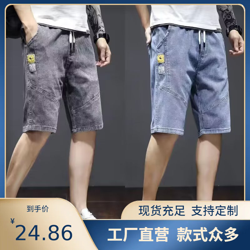 伸縮性ウエストストレッチデニムショートパンツメンズルーズドローストリング夏薄手の5点パンツ外国貿易新しいアウターミッドパンツ
