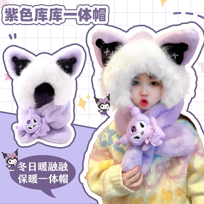 子供のぬいぐるみの帽子2024冬の新型のイチゴの熊のクロミアニメの2つの一体型の厚いベルベットの一体型の帽子