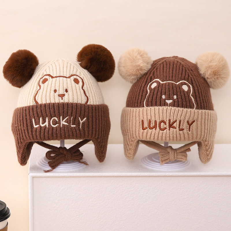 韓国版冬の帽子子供用ニット帽LUCKY熊双球耳保護ウール帽