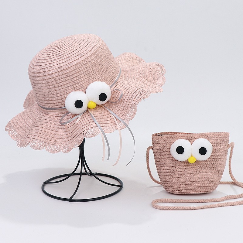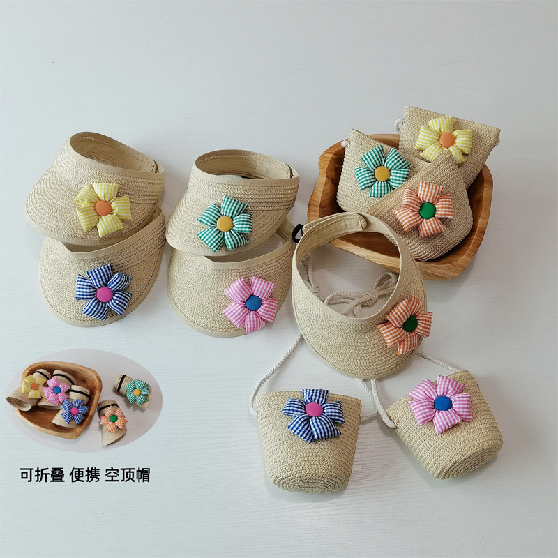 子供夏草編み帽子バッグセット子供旅行日焼け止め撮影凹形空頂麦わら帽子小銭入れ
