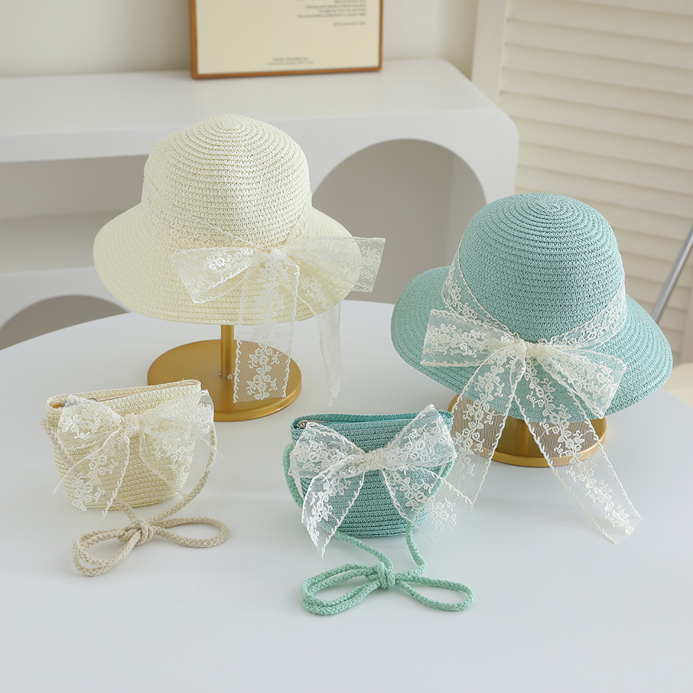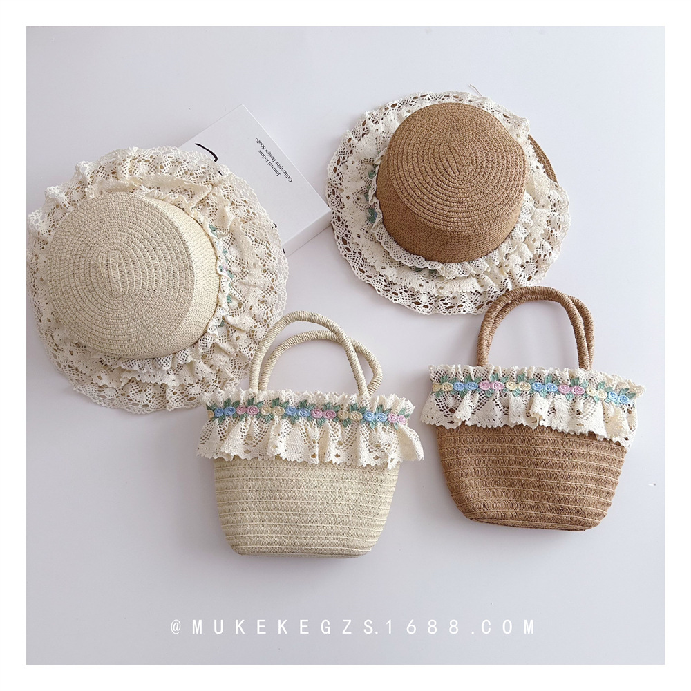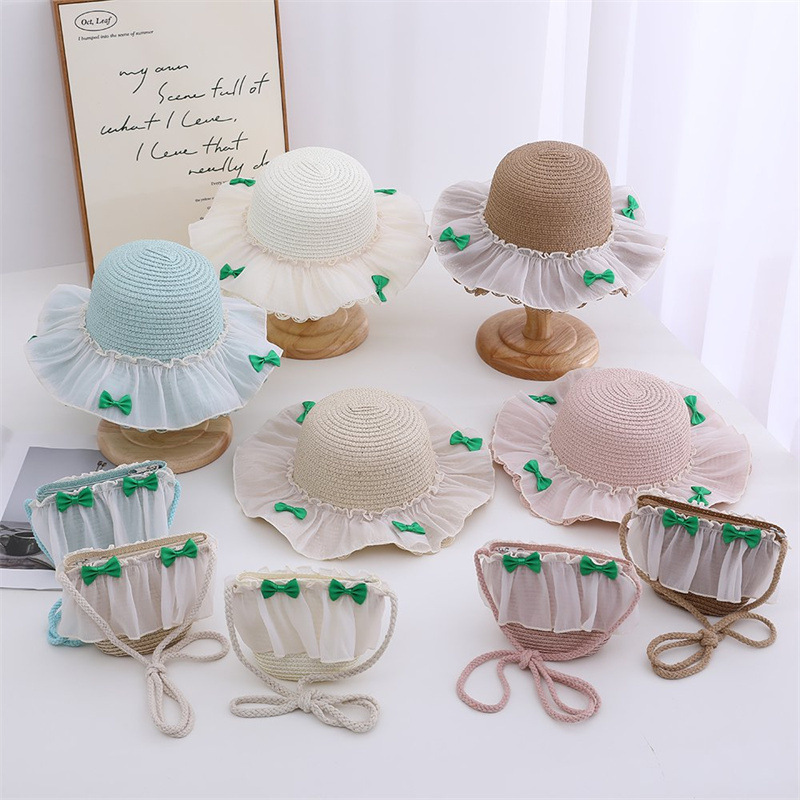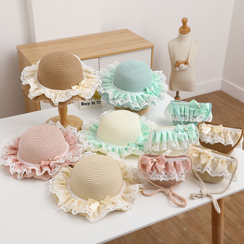 子供の麦わら帽子春と夏の日焼け止めサンハット女の赤ちゃん小銭入れサンハットセットレース帽子バッグ