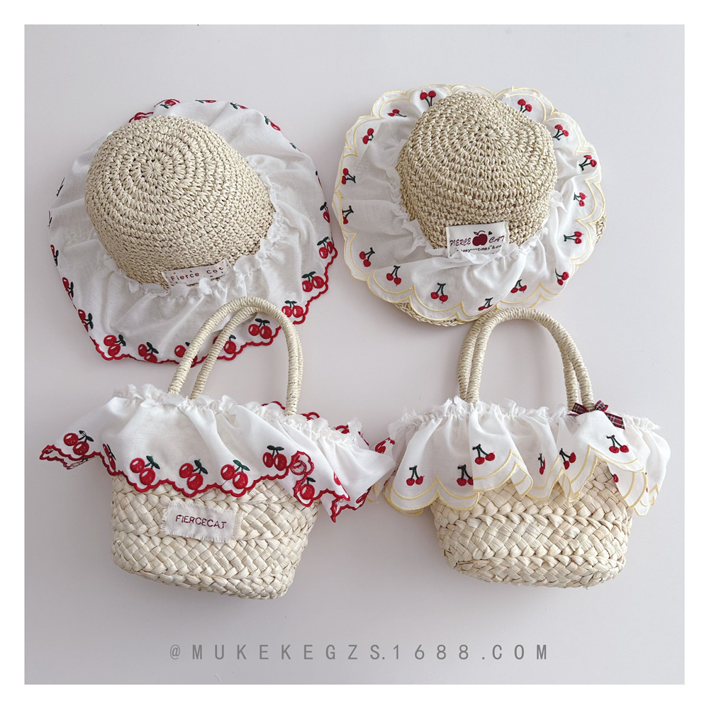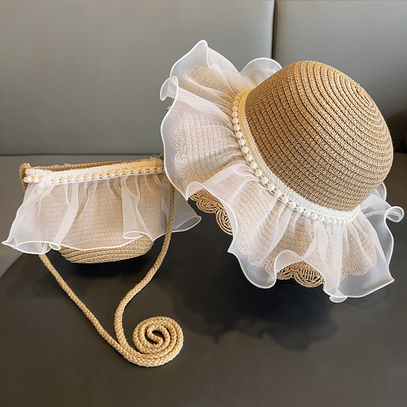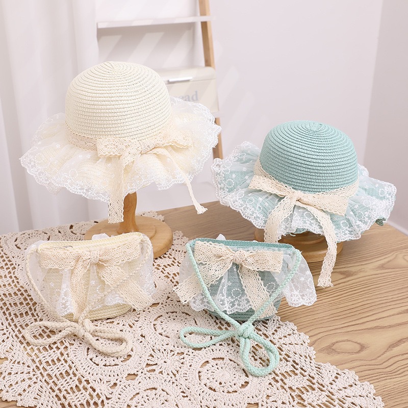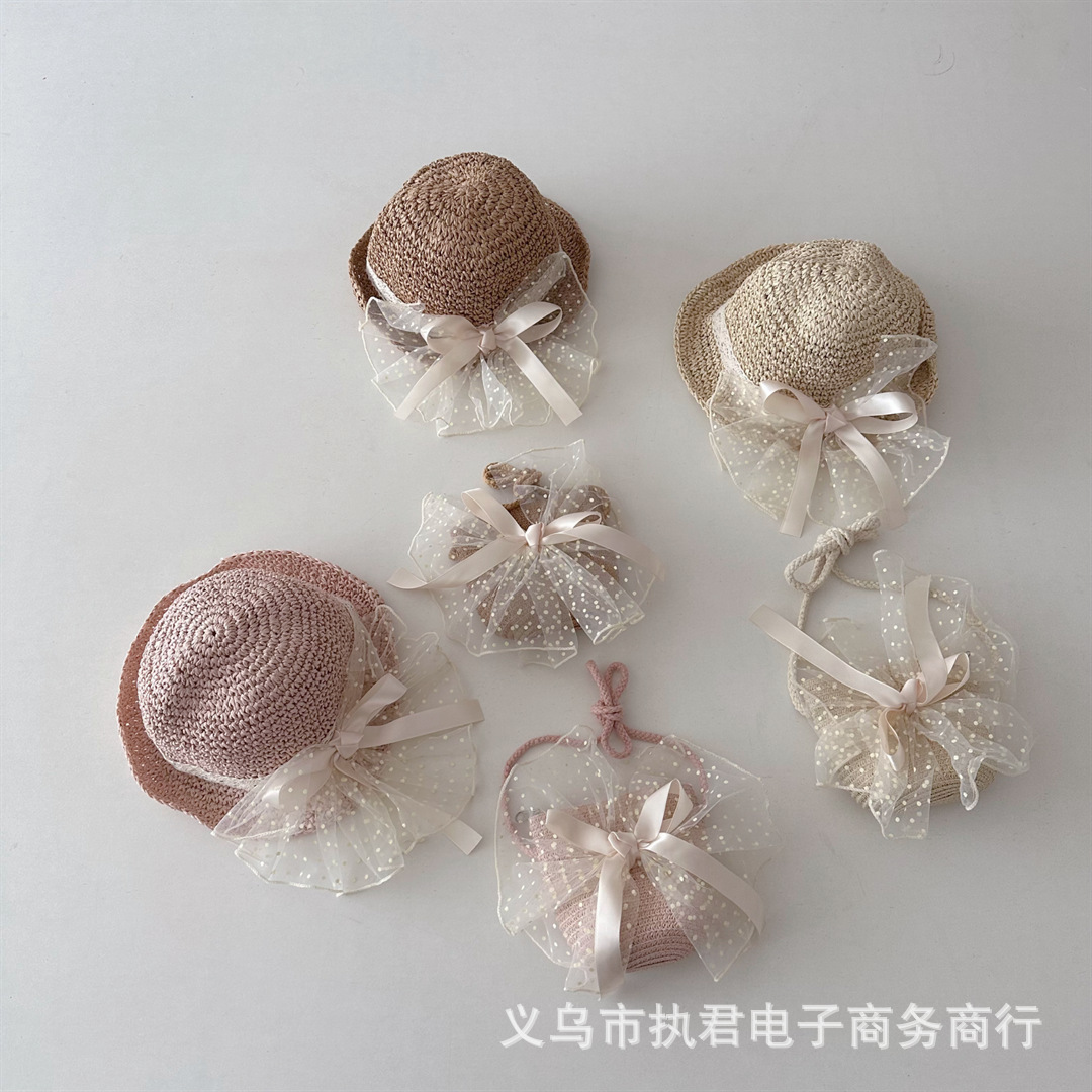 子供の麦わら帽子春と夏の日焼け止めサンハット女の赤ちゃん小銭入れサンハットセットレース帽子バッグ