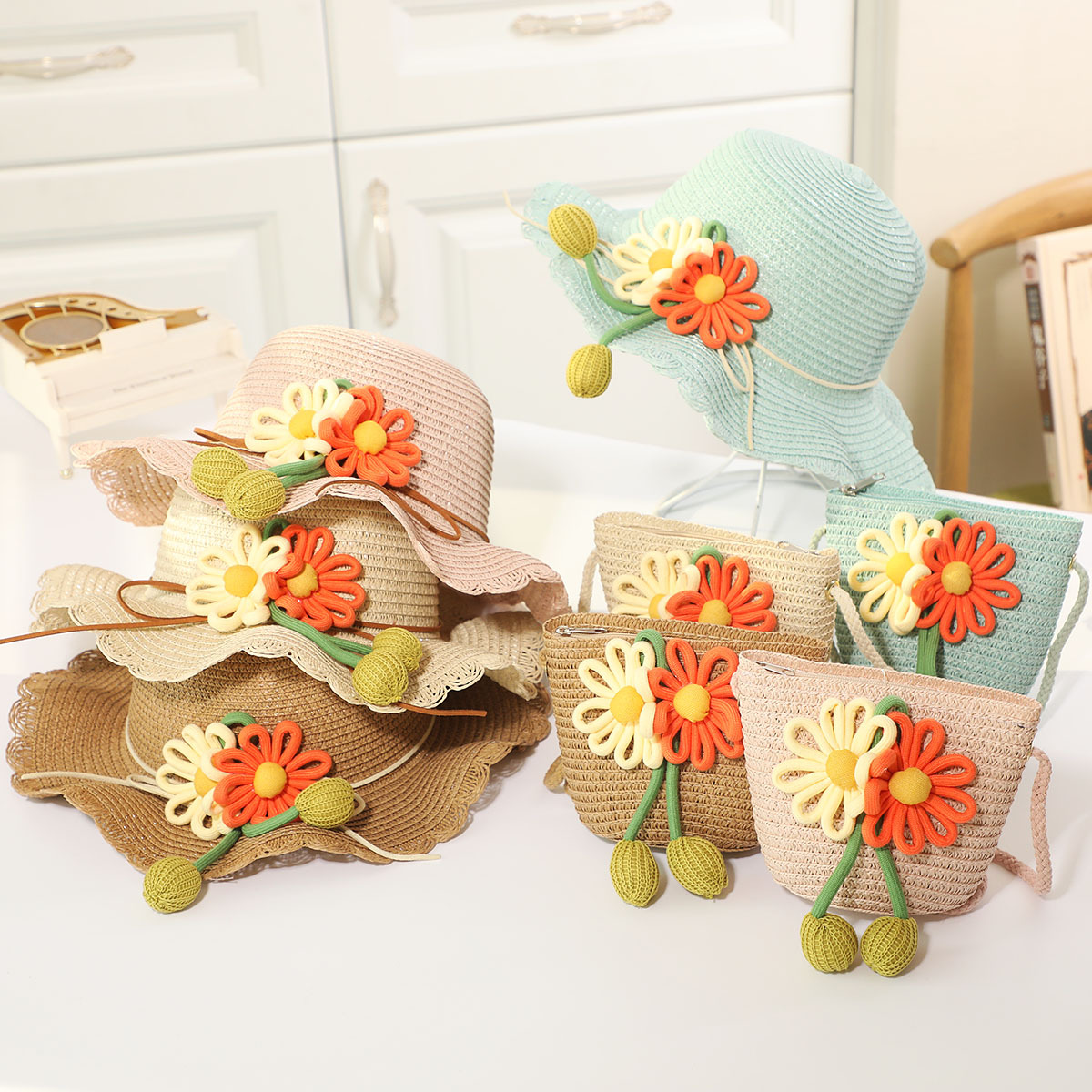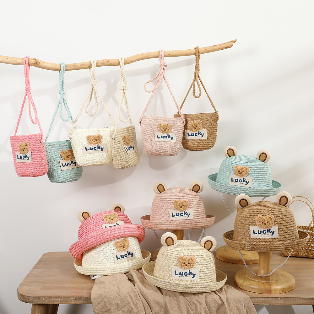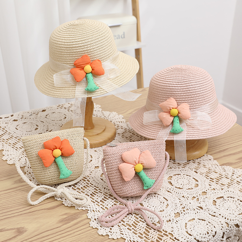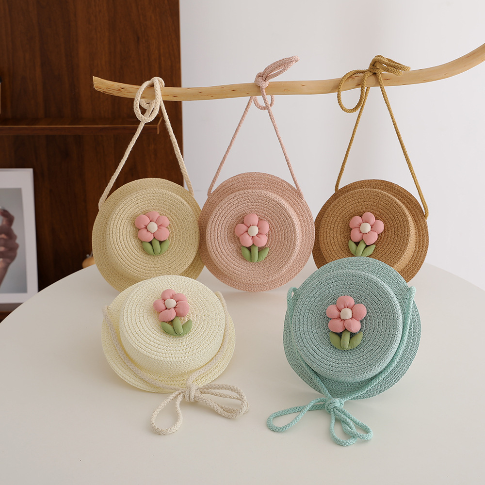 女の子の春と夏の帽子、子供用カジュアル織バッグ、サンハット、ベビークロスボディバッグ、フィッシャーマンハット、小銭入れ、ストローバッグ