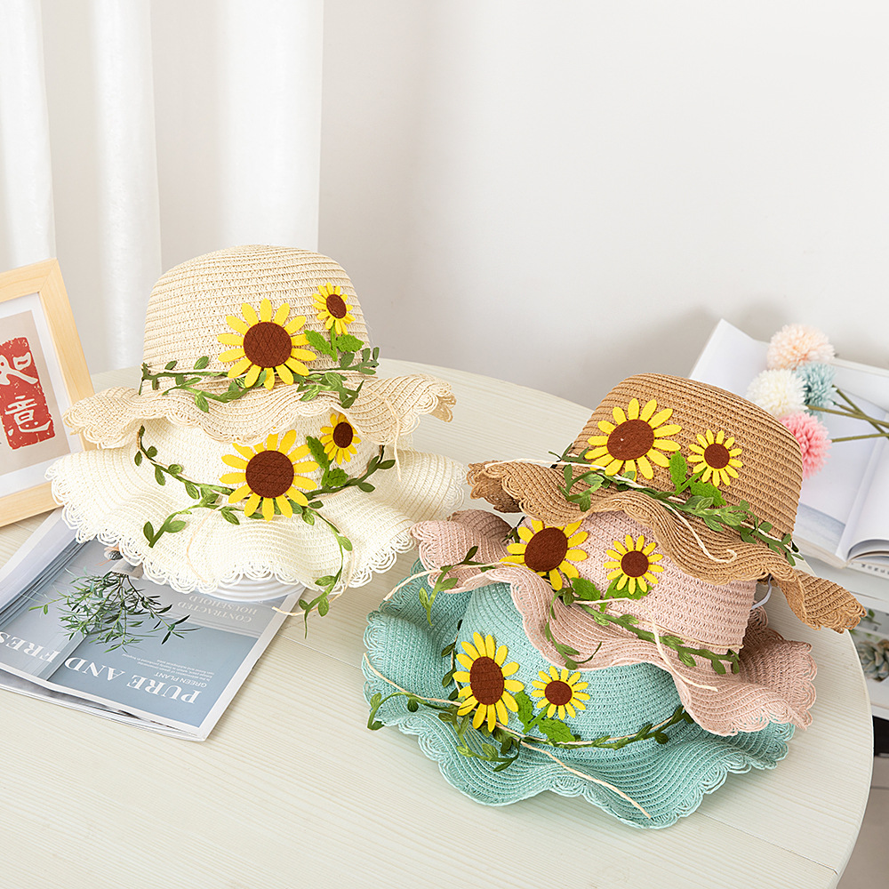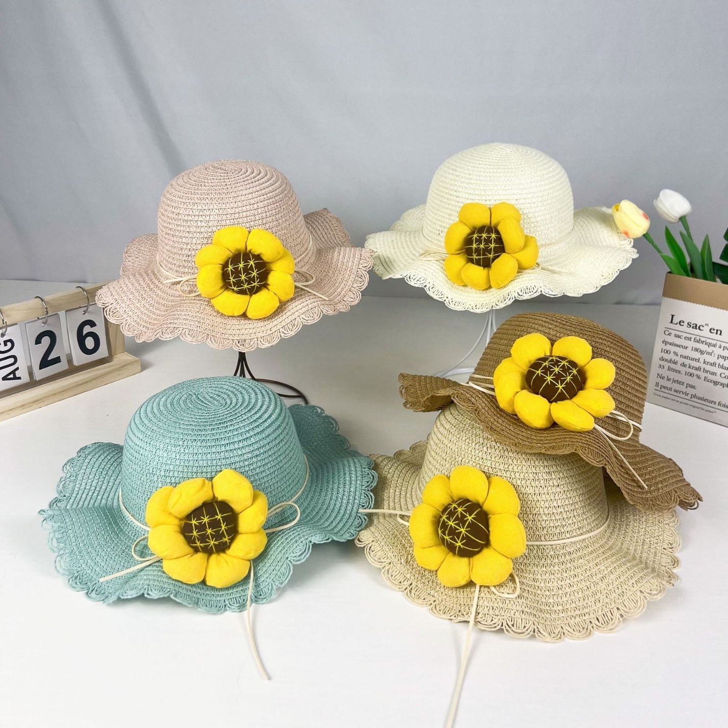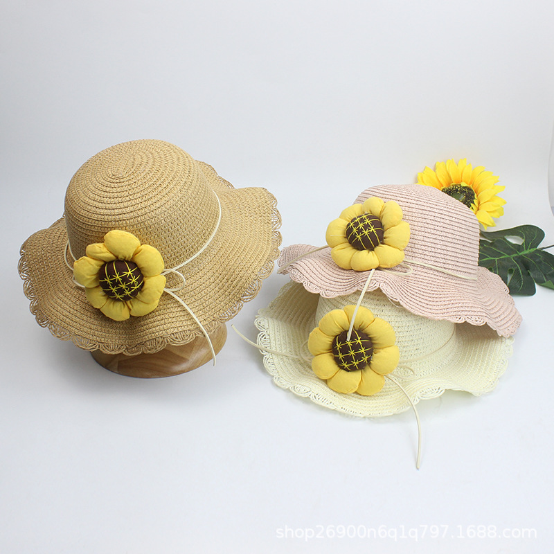 子供の日よけ帽子の女の子の春夏の新型の麦わら帽子の小銭入れのヒマワリの大きいつばの波の縁の帽子
