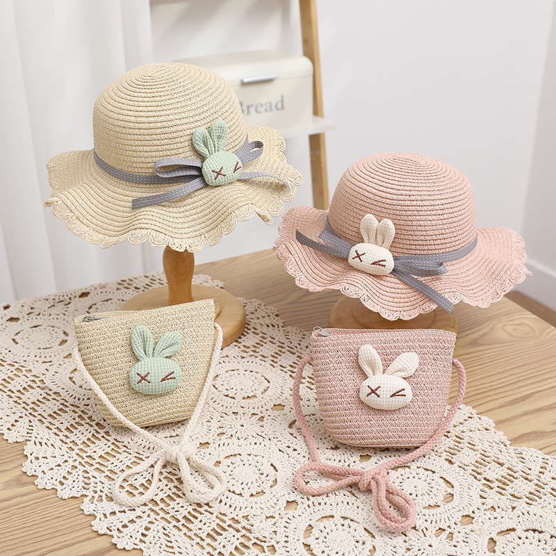 新しい夏の子供の麦わら帽子の女の子の日よけ帽子はかわいい漫画のウサギの耳の赤ちゃんの帽子の小銭入れを旅行します。