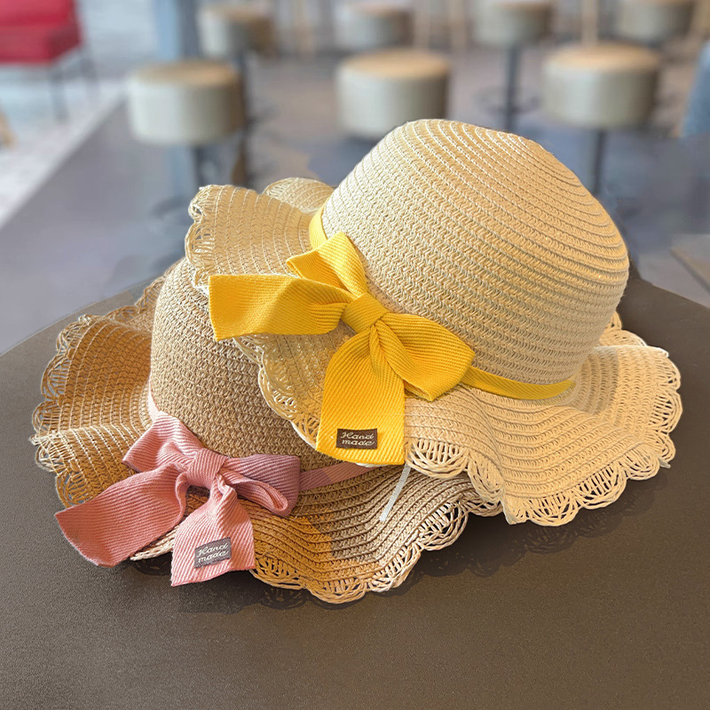 子供用麦わら帽子小銭入れバッグリボン麦わら大きなつば日焼け止め帽子レース日よけ帽子女性の盆地帽子