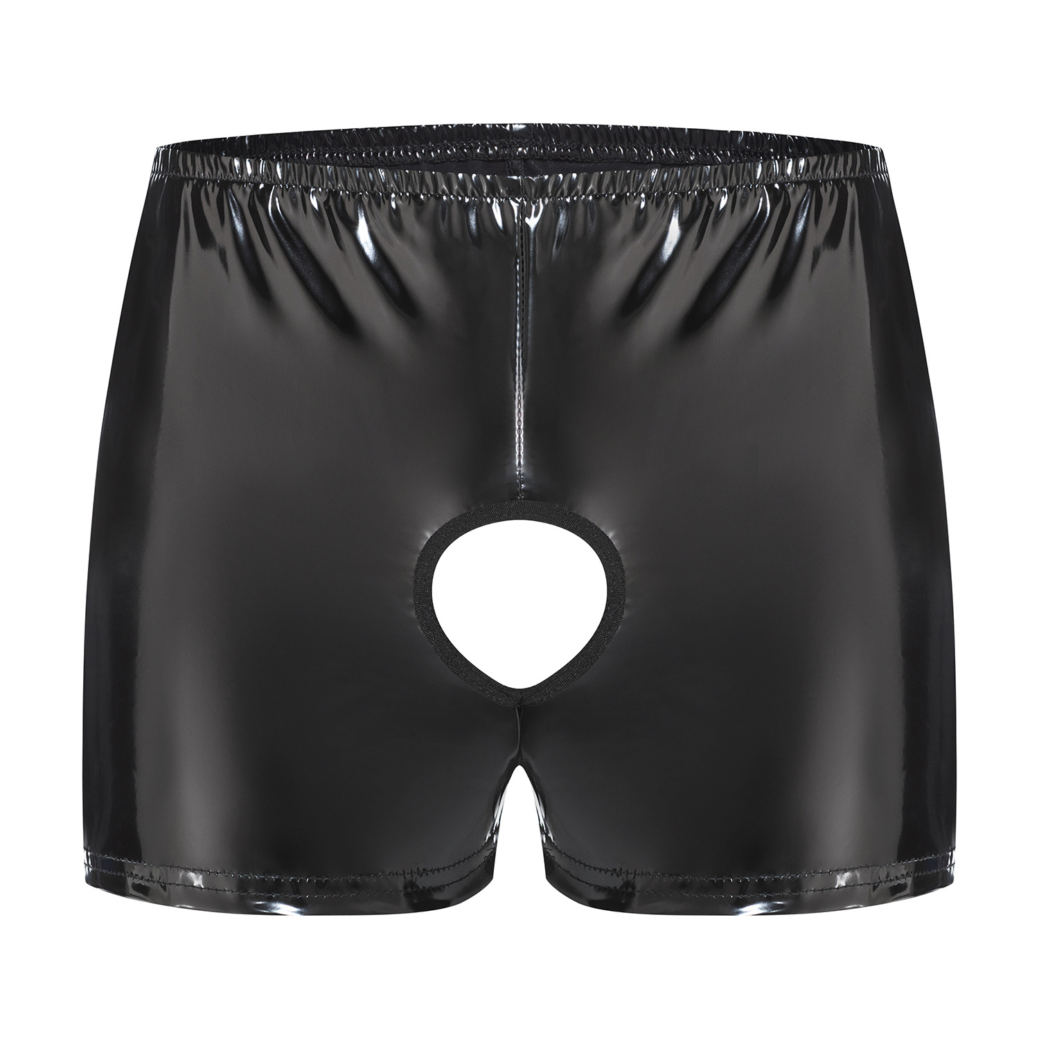 国境を越えた製品の男性pvcの明るい皮の平角のズボンのセクシーなオープン皮の半ズボンのサイズは正確で異臭がありません。