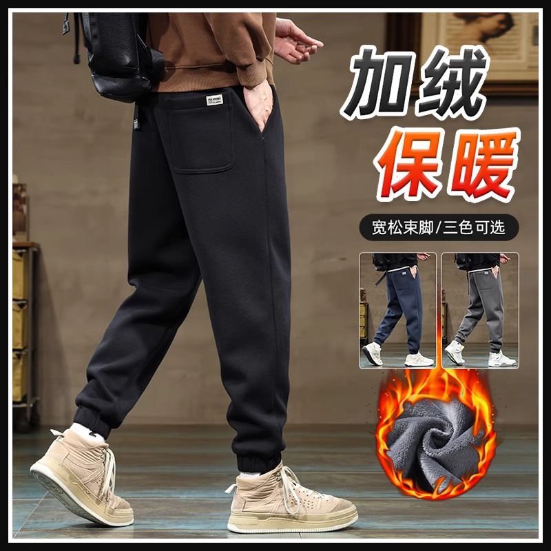 秋冬華綿とベルベットの厚い衛ズボン男性保温純色カジュアルパンツ男性ゆるい大サイズのロゴ衛ズボン