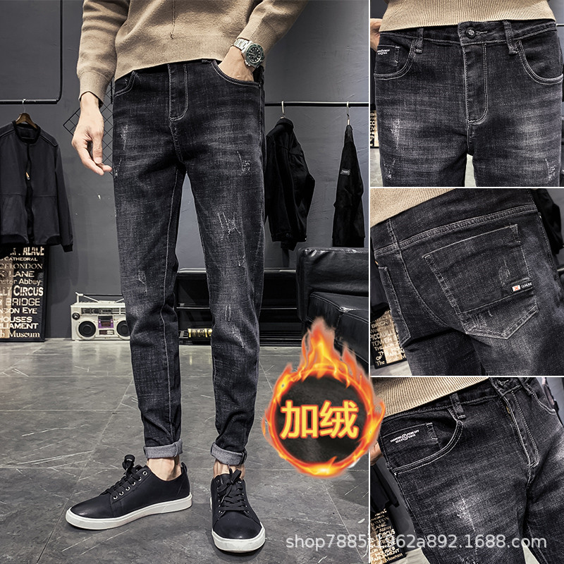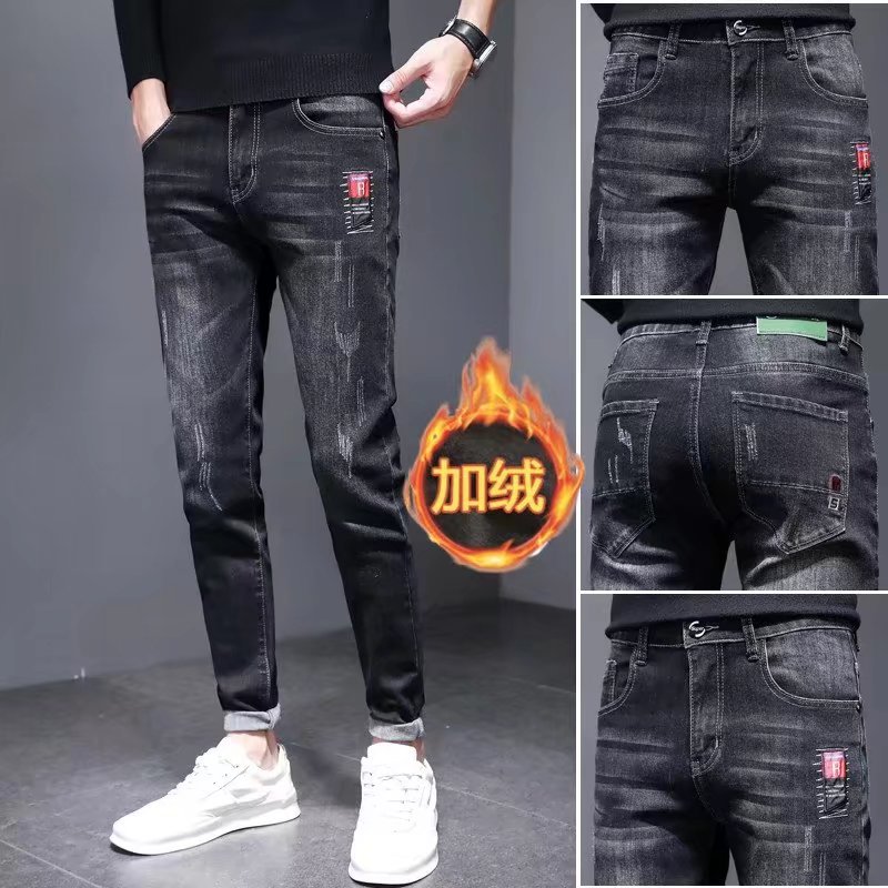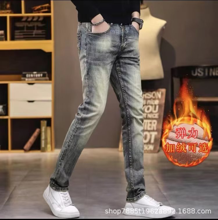 2023秋冬の韓国版ファッションファッションの新型の修身の小さい足とベルベットの厚いジーパンの男性は見ることができます。