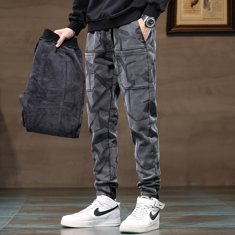 2023秋冬の新型高弾六ポケットジーンズファッション冬の新型ベルベットズボン保温男性服