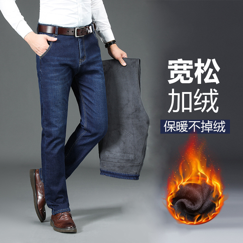 秋冬の中高年カジュアルジーンズにベルベットをつけて、お父さんがストレートでゆったりした保温ロックをつけて、ベルベットのズボンをつかむ