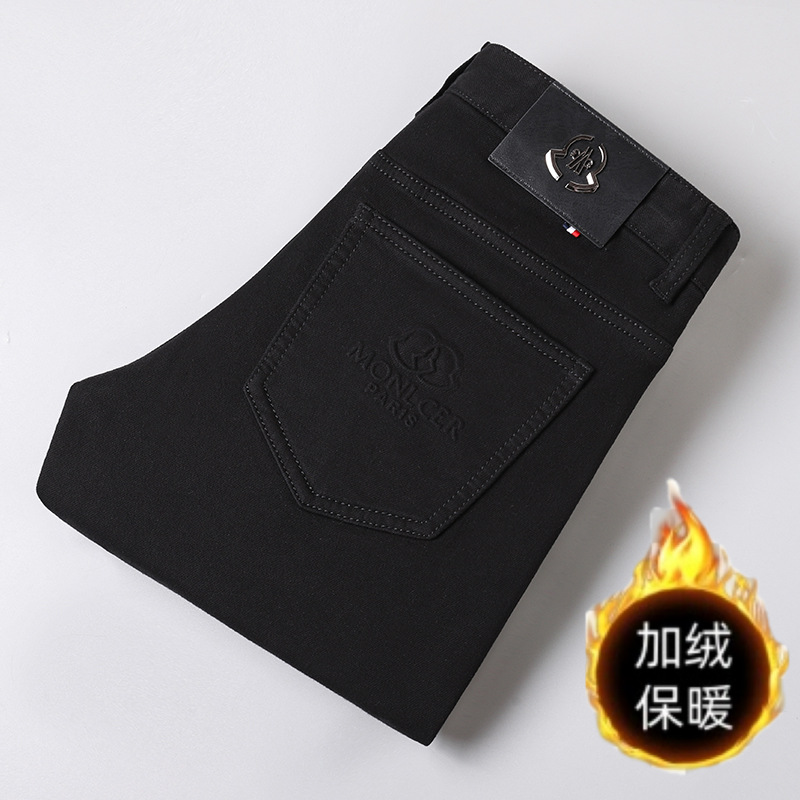 越境秋冬の新型弾力性とベルベットのデニムのズボンの青年男性のビジネスは身を修めて厚い直筒の紳士服を厚くして保温します。