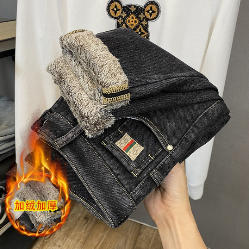 冬のベルベットは新しい池のジーンズの男性モデルを厚くして、2024秋の新しいストレートのゆるい修身灰色の秋冬モデル
