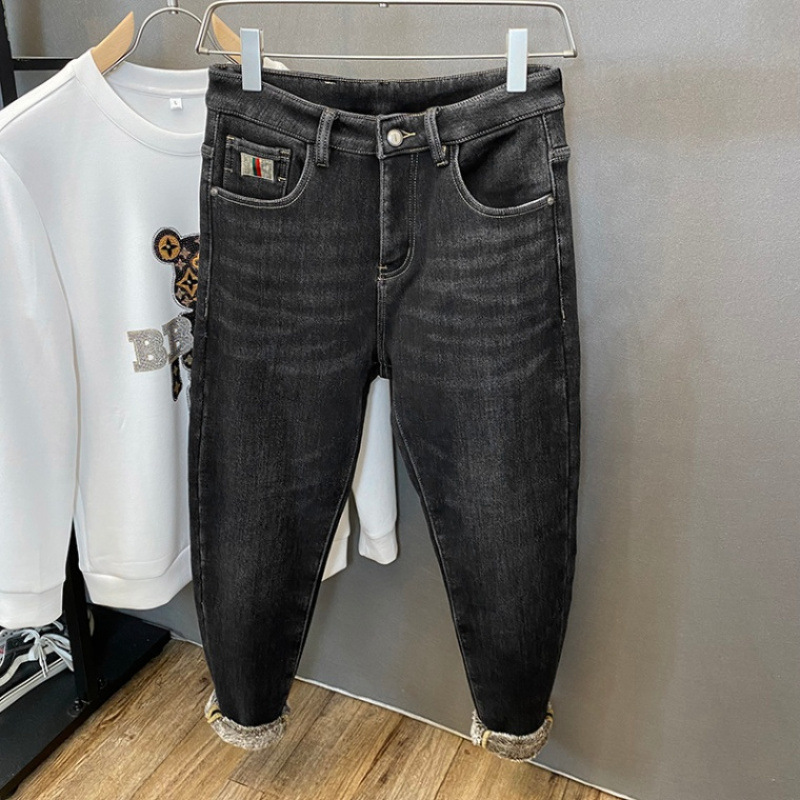 2024秋冬ベルベット保温ジーンズ男性欧品高級軽贅沢小足百合潮流修身ズボン